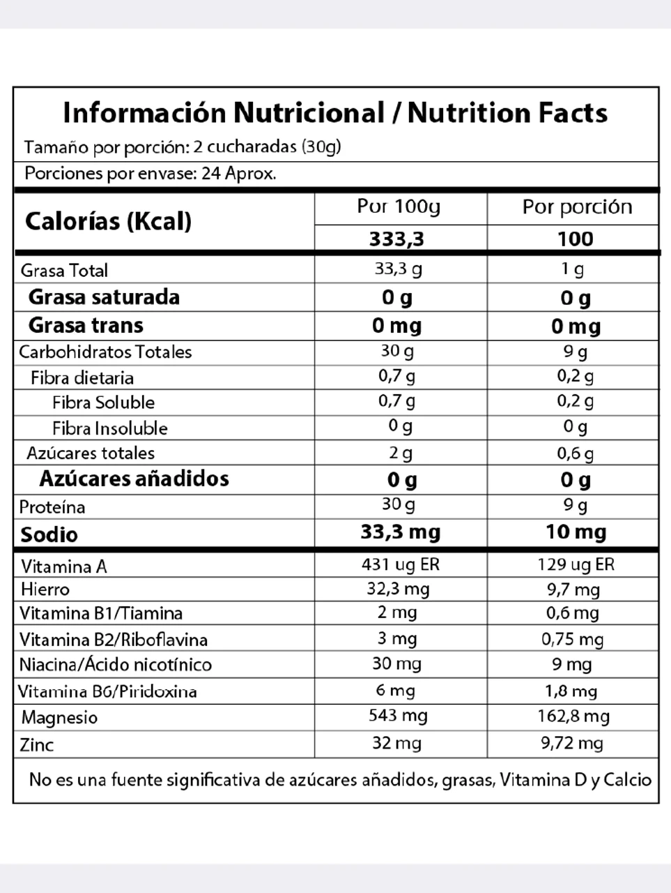 - Vitaminas: A, B1, B2, B6, Niacina, Hierro, Magnesio, Zinc